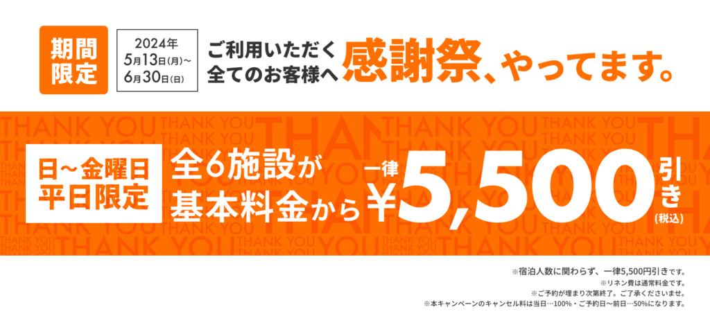 ・2024/5/13〜2024/6/30の平日(宿泊開始日が日曜日から金曜日)の期間にご宿泊されるお客様